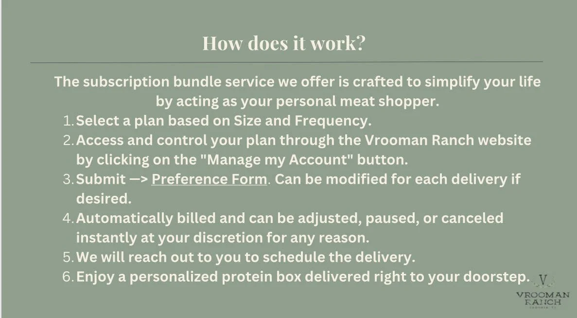 Introducing: Custom Boxes Apr 6 Written By Rebecca Vrooman Preference Form Link Order Subscription Here Butcher BoxVrooman RanchMeat & Eggs BoxMeat Subscription DeliveredMeat BoxMeat Box DFWRanch with Meat Box SubscriptionRanch DFWSubscription Meat BoxLocal RanchesLocal RanchGrass FinishedMeat DeliveredCarnivore DietCarnivore Diet Subscription Box Rebecca Vrooman